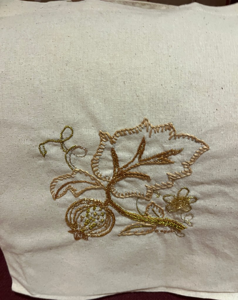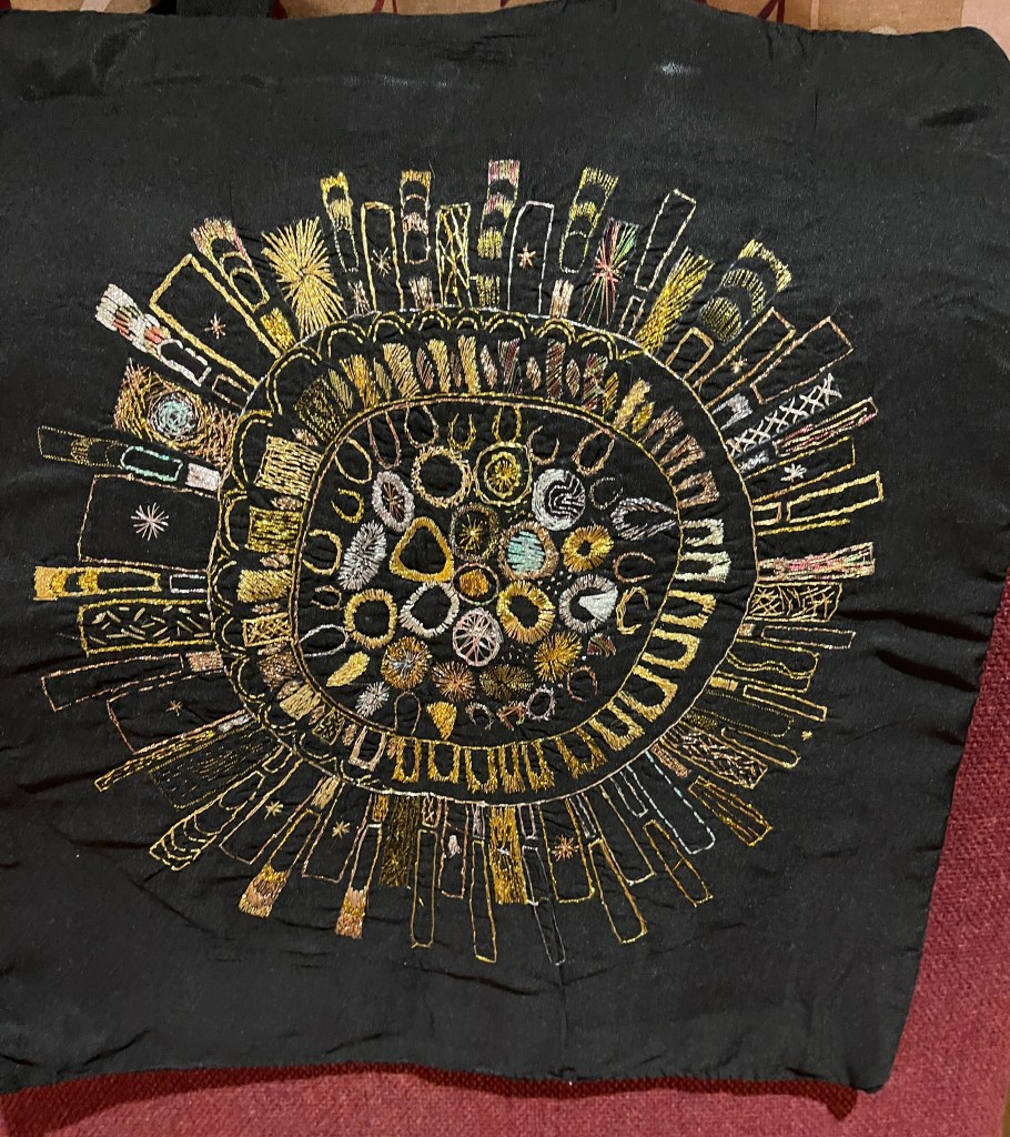 We listened to Anne’s presentation which updated us about the digitization project. Anne (one of our members) is a trustee of the Guild and is actively engaged with the lengthy and technical process involved in the project. She shared a wide range of insights and slides, illustrating both the historic work itself and the effort and techniques involved in its digitization. One of the most important decisions taken at the outset was the choice to use one very skilled photographer whose skills and advice has been invaluable. He suggested for example photographing the front and back of the pieces, an invaluable suggestion.