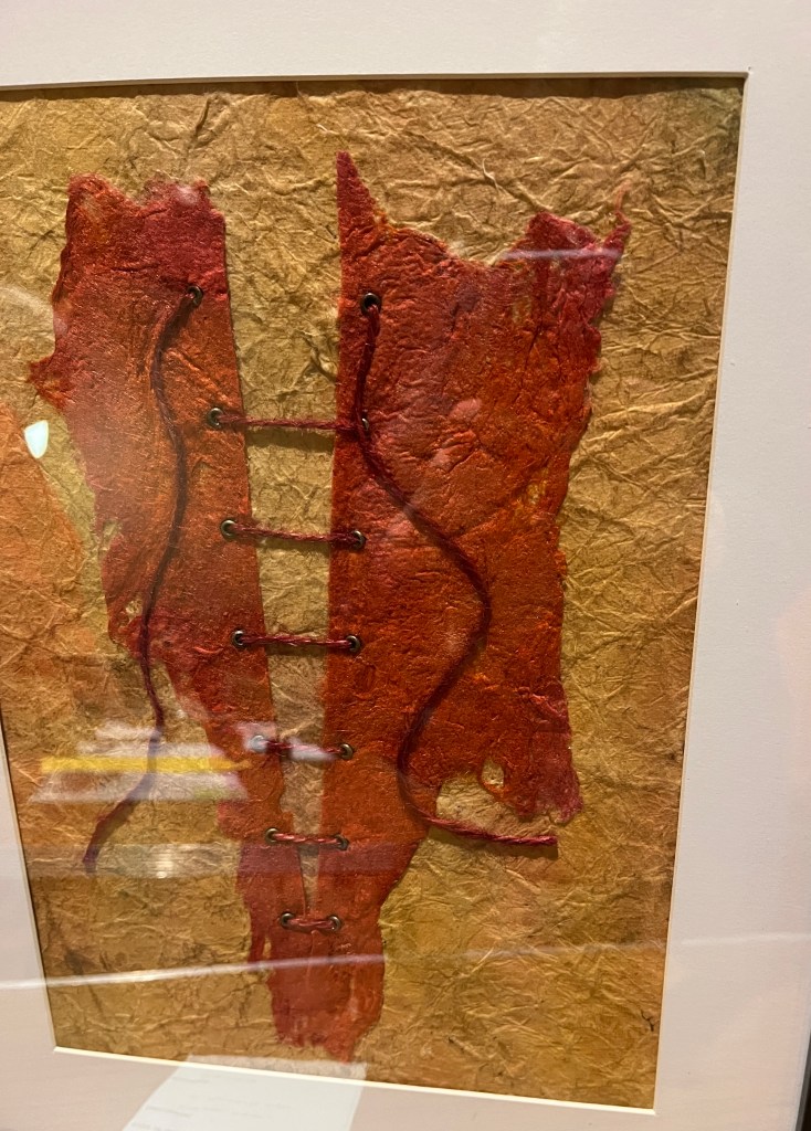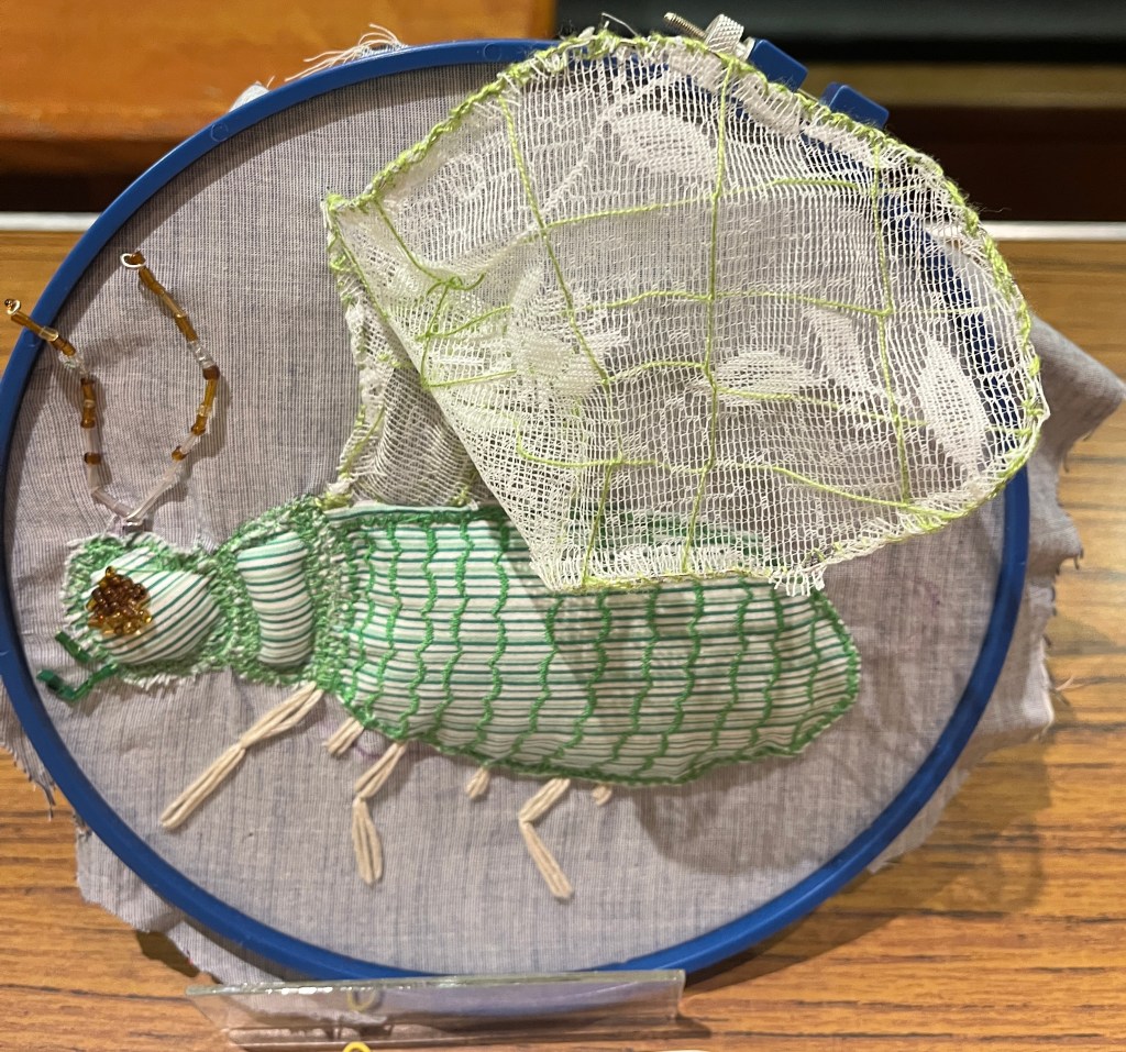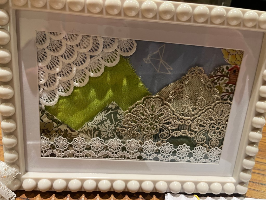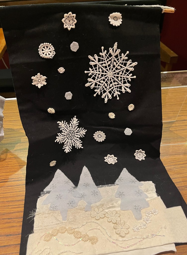 We also held our winter competition with entries shown below all the pieces were very successful and member votes were extremely close, but the winner was Marion with her witty take on the competition theme ‘Amazing Lace‘. Marion’s entry was entitled ’unlaced ’. Other entrants were, in no particular order, Janet l, with her winter landscape,Meriel and her ‘Seasonal Lace’ christmas tree, Isabelle H, ‘West Wales’, Julie L ‘Lacewing Fly’, The entries are shown below many congratulations to all.