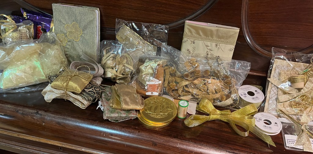 We also held our raffle the contents of which, and the two beautiful gold bags, decorated by Rowan and Gill are shown below