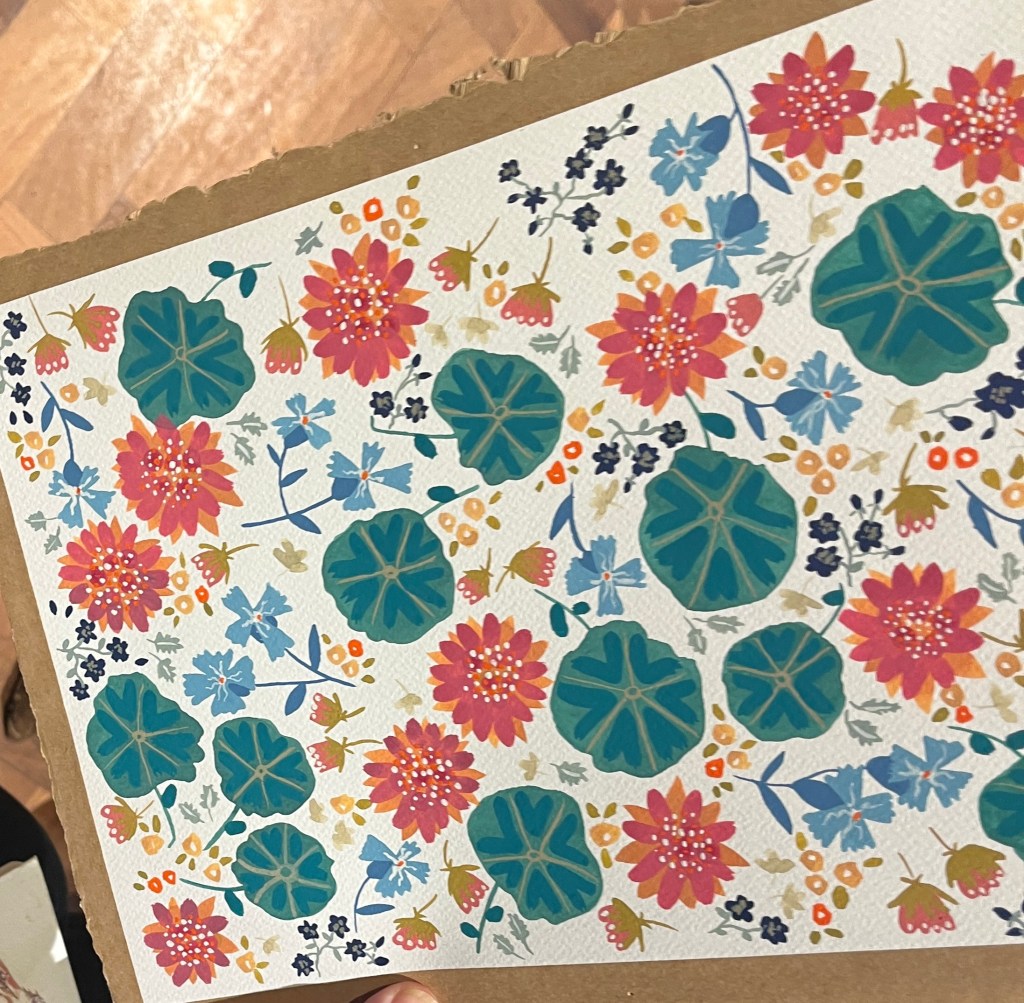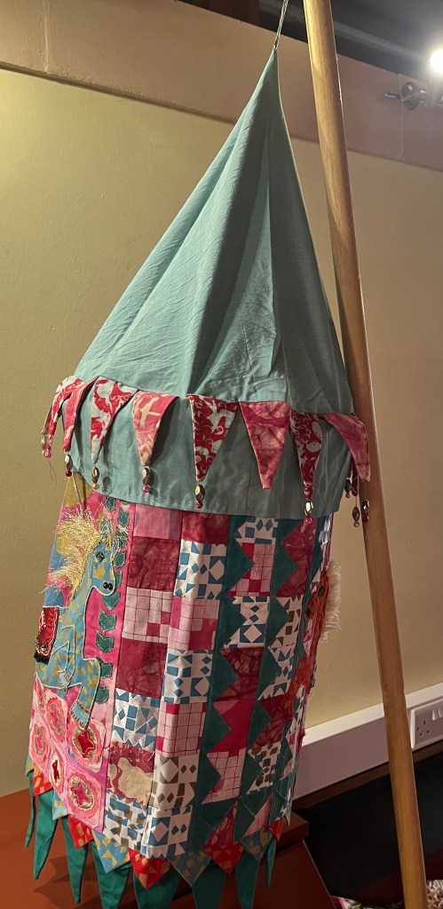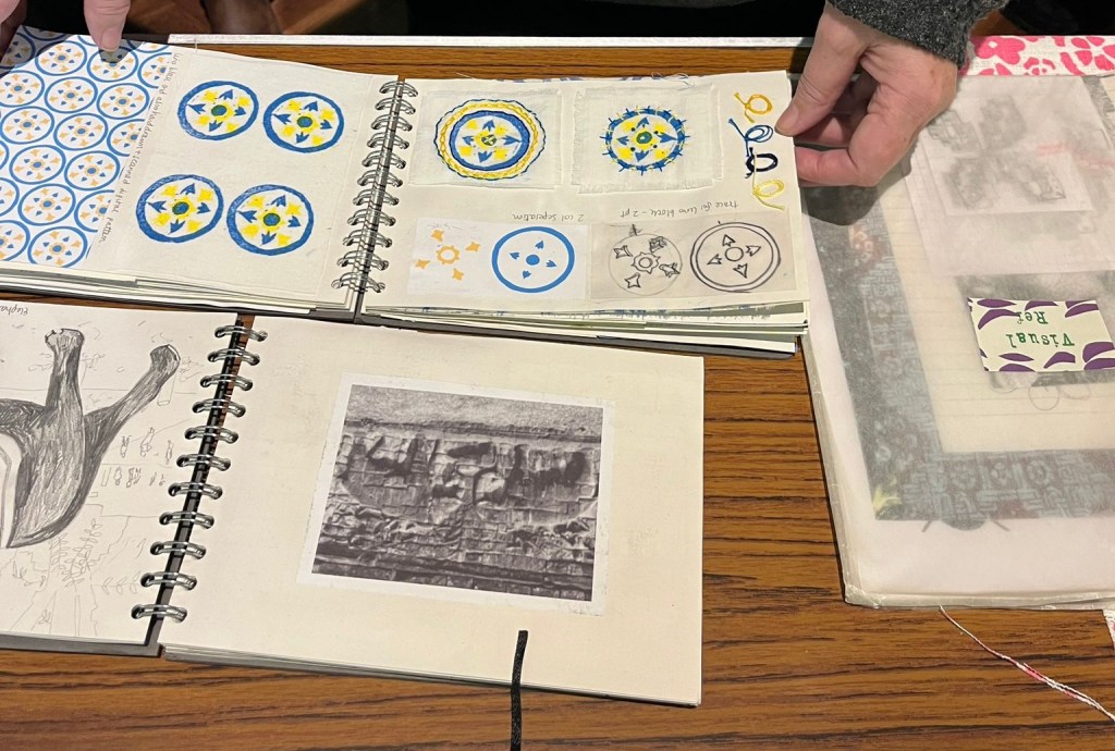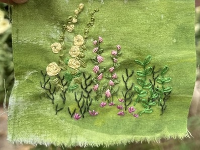 Claire taught textiles at MAC and has used a range of approaches including foiling, screen printing, ecodying, mono printing and batik. She also uses embroidery and free machine stitching. Claire was also an artist in residence at Winterborne teaching painting drawing and stitch there. Sadly this coincided with Covid and prevented her final exhibition taking place but Winterbourne and beautiful gardens more generally remain a significant source of inspiration. Claire uses sketch books including books from her time at Winterbourne to provide inspiration.She has also drawn on her travels, most notably a trip to Malaysia and a hanging resulting from that trip is shown below. She is hoping in the future to also develop work based on a trip t Japan.
