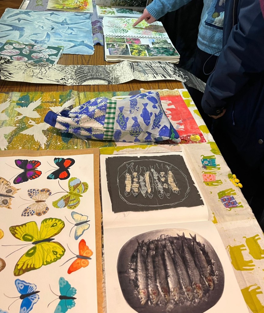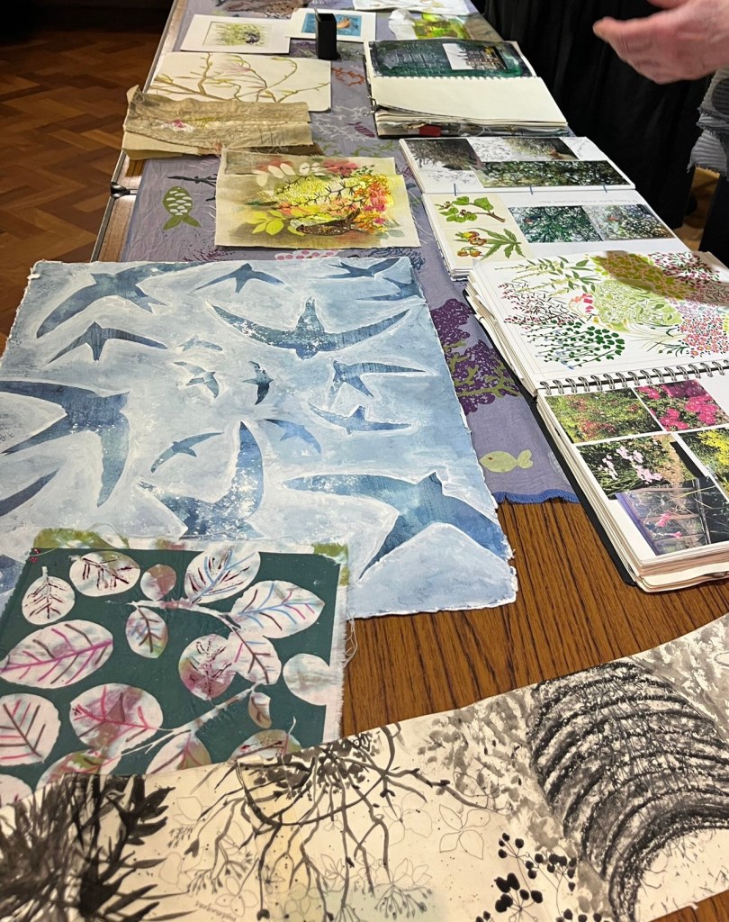 Claire eventually displayed her work in a RSBA exhibition, winning a prize and selling some pieces. This gave her the confidence to become a free lance artist. She learnt computer skills to support her pattern making and to produce her work and was able to sell her prints. One design that sold was notably used in Huggies Wet Wipes. This work was however competitive and not well paid. Claire emphasized in her talk the importance of not just working to outcomes, but to also taking the time to play and use a range of projects to develop ideas. She is also a believer in hoarding to provide sources of inspiration.